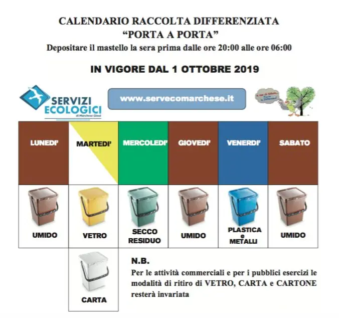 «L’obiettivo che ci poniamo ora, d’intesa con l’Amministrazione Comunale sempre attenta alla tutela dell’ambiente e al contenimento dei costi del servizio di smaltimento dei rifiuti, è il raggiungimento del 80% di raccolta differenziata. Perché l’obiettivo è importante? Perché il processo di smaltimento del rifiuto indifferenziato è molto costoso. Possiamo ottenere un risultato simile solo se tutti prestiamo una maggiore attenzione al corretto conferimento dei rifiuti». Per le attività commerciali e per i pubblici esercizi le modalità di ritiro di vetro, carta e cartone resterà invariata. Divieto assoluto di sacchi neri per qualsiasi tipologia di materiale da ritirare.