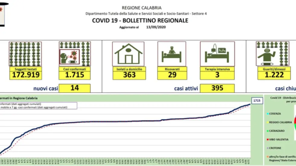 - Cosenza: 13 in reparto; 3 in terapia intensiva; 90 in isolamento domiciliare; 461 guariti; 34 deceduti.
