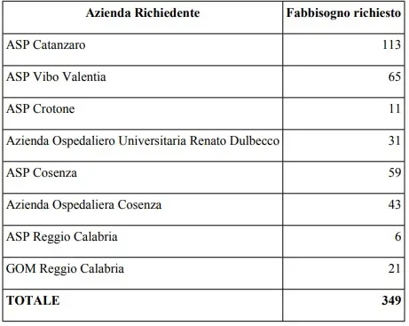 I posti saranno distribuiti tra le aziende sanitarie provinciali e ospedaliere della Regione Calabria, con il fabbisogno più consistente segnalato dalle Asp di Catanzaro e Vibo Valentia, seguite dall’Asp di Cosenza, dall’Azienda ospedaliera di Cosenza, dall’Azienda ospedaliero-universitaria “Renato Dulbecco” e dalle strutture sanitarie di Reggio Calabria.