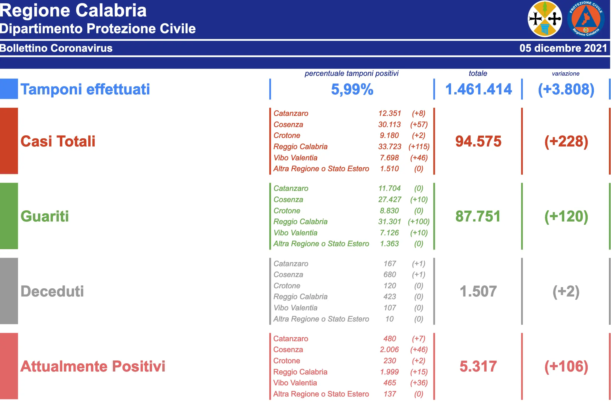 Nel bollettino della Regione Calabria si contano in totale 228 casi di Coronavirus con 2 morti. Ci sono 120 guariti di cui 10 nel cosentino