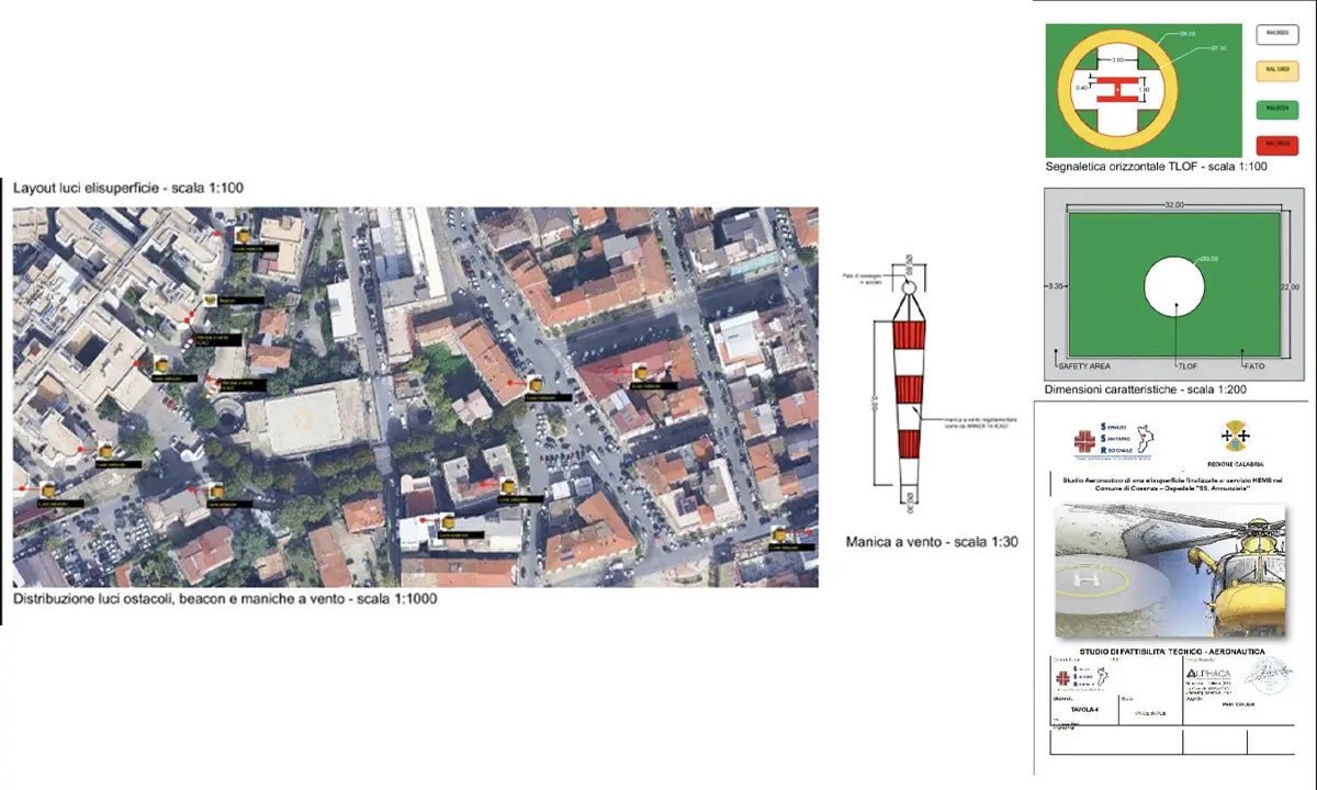 Le tavole progettuali definiscono anche un corridoio di volo dedicato, con direttrici precise, pensato per attraversare in sicurezza l’area urbana e ridurre i tempi di arrivo in ospedale. Un elemento che rafforza ulteriormente l’efficacia del sistema di emergenza.
