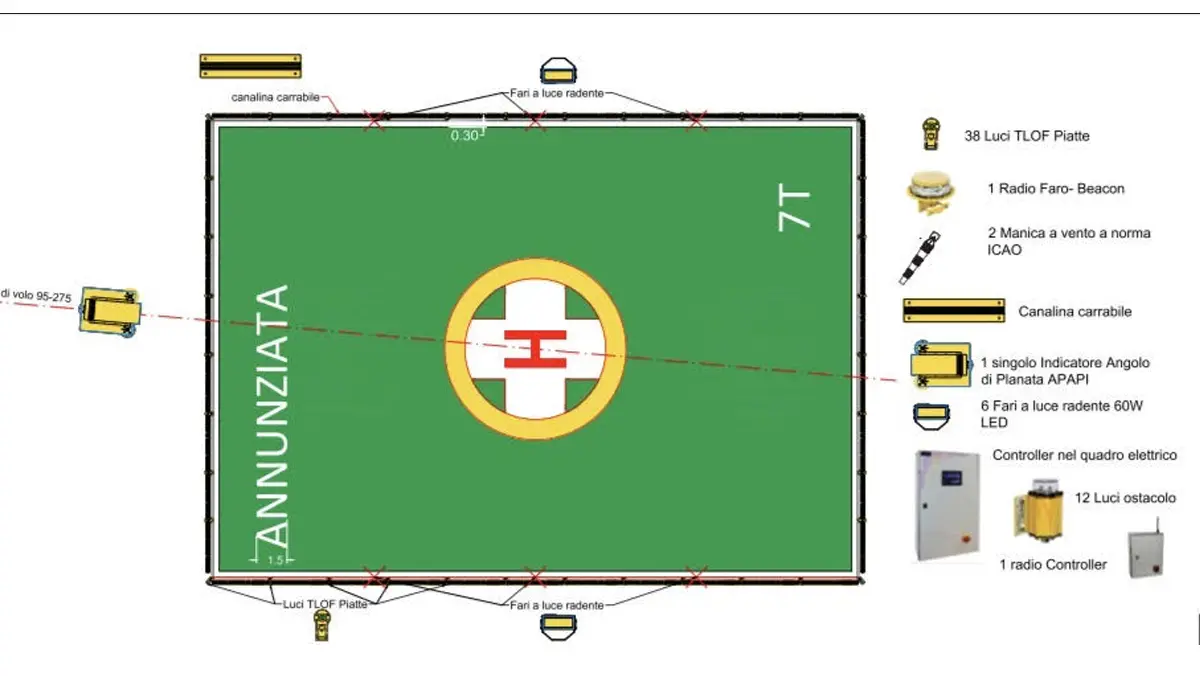 Il progetto prevede una elisuperficie in grado di operare sia di giorno che di notte, con classificazione Classe 1, il più alto livello di sicurezza per il trasporto sanitario. La piattaforma sarà dotata di: sistemi di guida all’atterraggio (APAPI); beacon aeronautico; illuminazione avanzata con decine di punti luce; segnalazioni e dispositivi conformi agli standard ICAO. Un’infrastruttura che porterà l’ospedale Annunziata dentro una dimensione tecnologica e operativa finora assente.