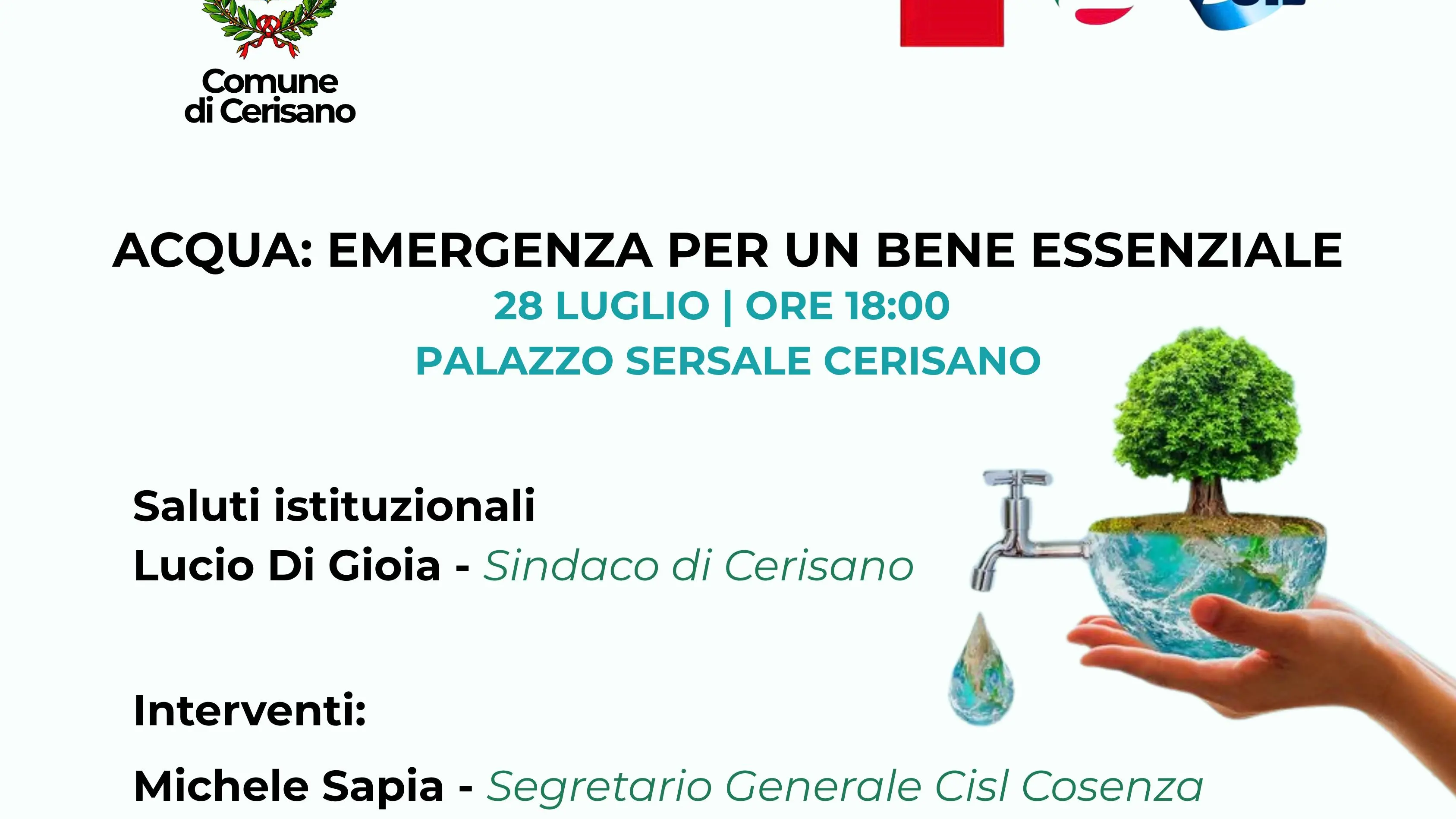 Lunedì 28 luglio, alle ore 18, il Palazzo Sersale di Cerisano ospiterà una tavola rotonda dal titolo “Acqua: emergenza per un bene essenziale”, organizzata dal Comune di Cerisano in collaborazione con CGIL, CISL e UIL. L’evento riunirà rappresentanti delle federazioni sindacali, del mondo politico locale e nazionale, con l’obiettivo di affrontare le criticità del Servizio Idrico Integrato (SII) e discutere soluzioni condivise.