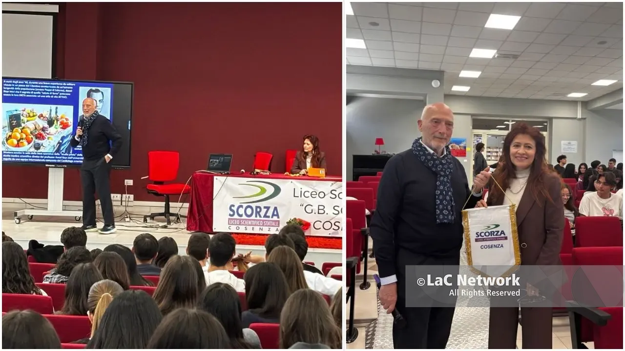 C'è un filo invisibile che collega il piatto sulla nostra tavola al destino del pianeta. Lo ha mostrato con chiarezza e passione il dottor Pietro Leo – già primario gastroenterologo presso l'Azienda Ospedaliera Annunziata di Cosenza, oggi docente di Scienze della Nutrizione presso l'Università della Calabria – nel seminario che si è tenuto nell'Aula Magna del Liceo Scorza nell'ambito dello Scorzino d'Oro. Un ritorno a casa, per lui che tra quei corridoi ha mosso i primi passi, e una lezione che il giovane pubblico ha apprezzato molto. Per quasi due ore, gli studenti sono rimasti incollati ai seggiolini, prestando tanta attenzione e rivolgendo diverse domande, dimostrando curiosità e spirito critico.