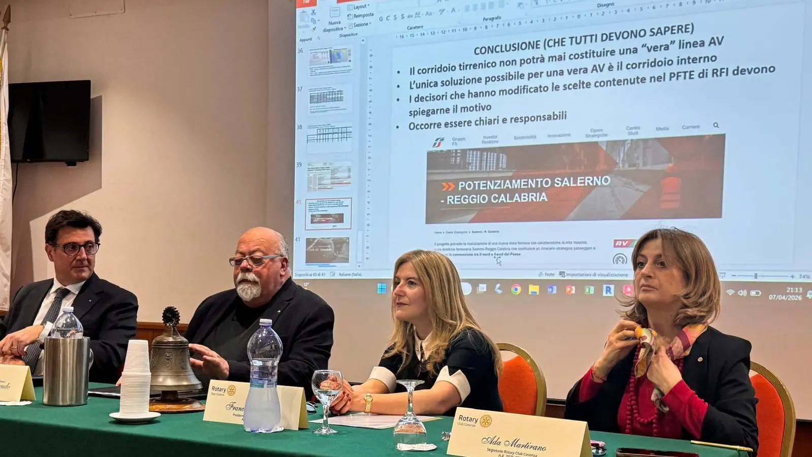 Martedì 7 aprile il club Rotary Cosenza ha organizzato un incontro molto partecipato sul tema dell’alta velocità ferroviaria. La relazione, introdotta dalla Presidente Francesca Criscuolo, è stata animata dal socio Giuseppe Lo Feudo, già Direttore Generale delle Ferrovie Calabro Lucane e da sempre in prima linea nella questione dei trasporti, e dal professore Luigi Martirano, ordinario di Sistemi Elettrici per l’Energia presso la Facoltà di Ingegneria dell’Università La Sapienza di Roma.