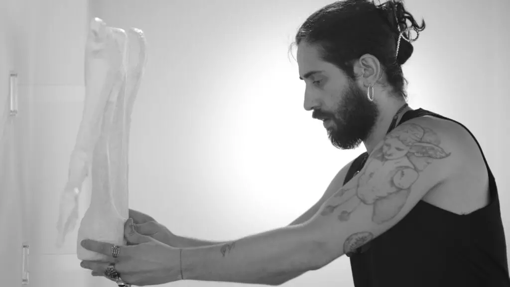 La seconda sala ospita il cuore dell’esposizione con l’installazione interattiva “Waiting”, che indaga il sentimento dell’attesa come condizione esistenziale condivisa. L’opera coinvolge direttamente il pubblico, trasformando il tempo sospeso in esperienza concreta. Attorno a questa installazione si sviluppa il dialogo tra calcografie e dispositivi luminosi: anatomie ossee di uccelli senza ali si sovrappongono a corpi femminili, generando immagini di intensa tensione visiva. I quadri luminosi rendono visibile il processo di costruzione dell’immagine, spostando l’attenzione sulla stratificazione e sul tempo che genera l’opera.