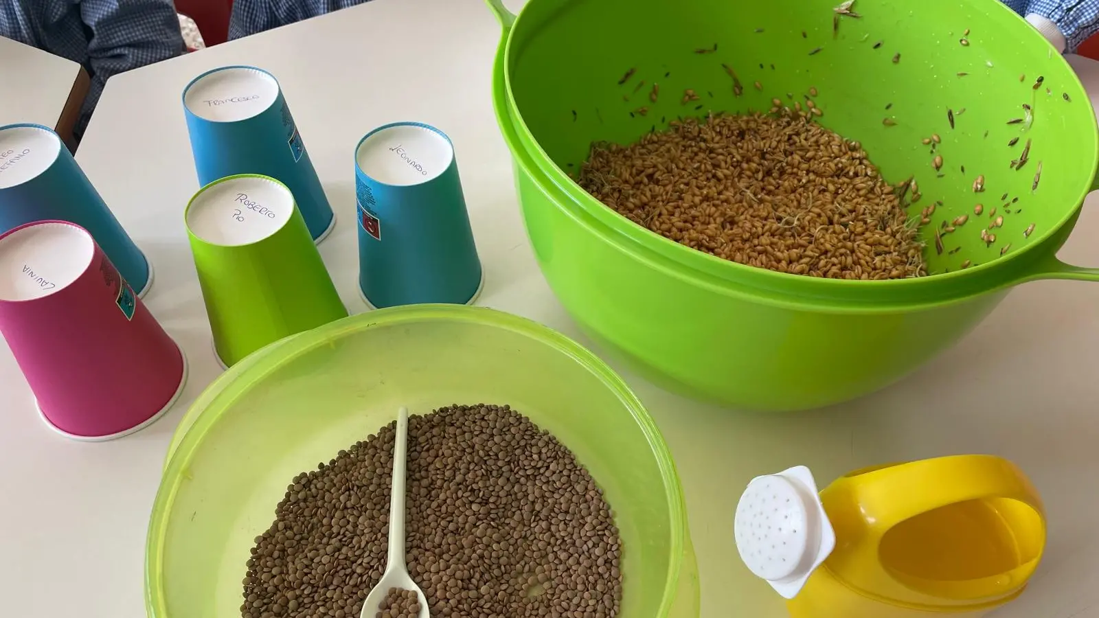 All’interno dei bicchieri sono stati disposti uno strato di cotone, uno di grano e uno di lenticchie, completando il lavoro con l’annaffiatura del seme. Un gesto apparentemente semplice, ma dal forte valore simbolico, perché richiama il tema della vita che germoglia e rinasce, uno dei significati più profondi della Pasqua.