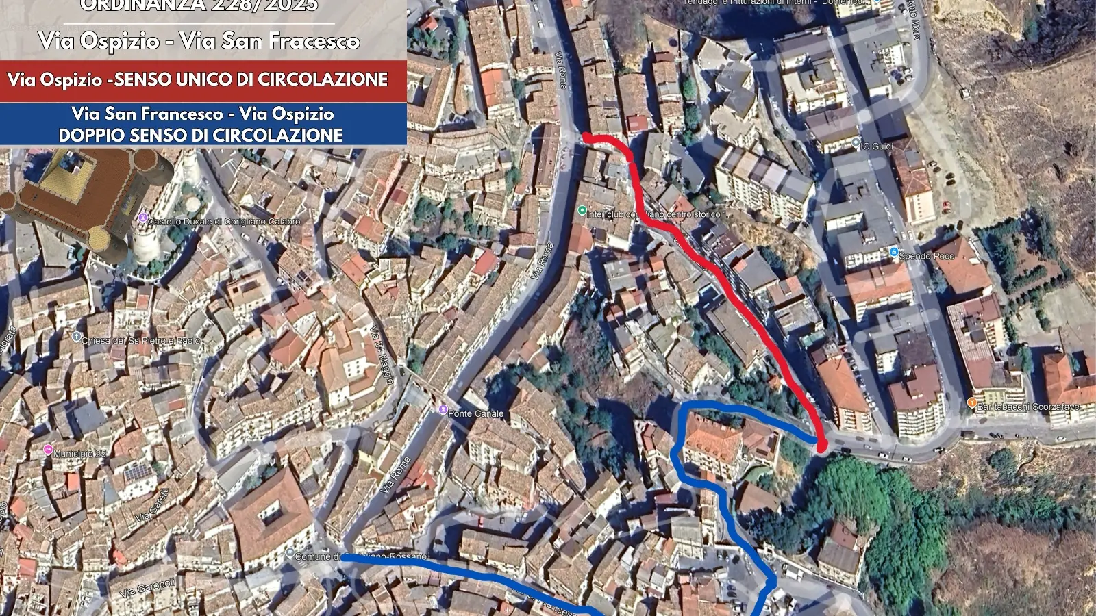 Potranno continuare a circolare soltanto i mezzi fino a 2,5 tonnellate, mentre quelli di massa superiore avranno l’obbligo di svolta su via Abenante–via Vittorio Emanuele in direzione Rossano–Ospedale. Via Roma resterà transitabile verso Castello Ducale e centro storico per i veicoli leggeri. Consentito anche il percorso inverso per i residenti delle aree interne del centro storico. Su via San Francesco viene istituito il doppio senso di marcia, con divieto di sosta su entrambi i lati; stessa regola su via XXIV Maggio e piazza del Popolo.