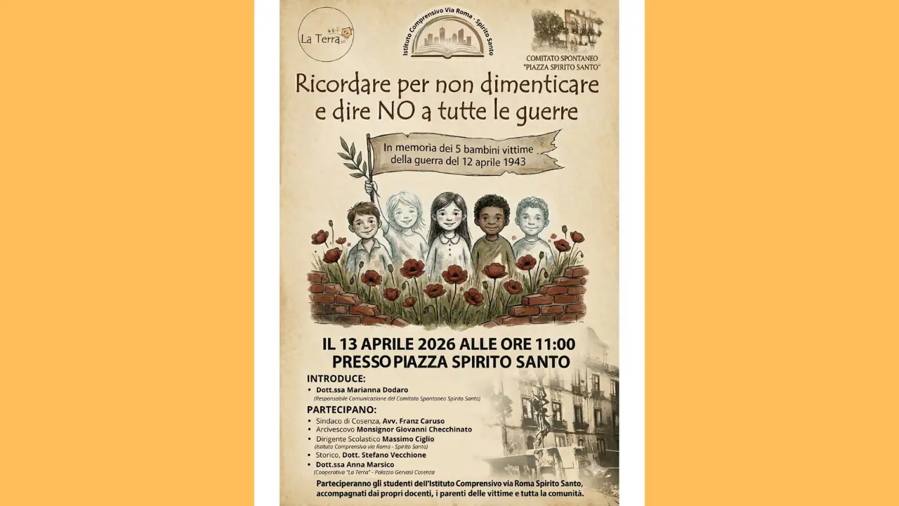 Un ricordo che attraversa le generazioni e che torna ogni anno a interrogare la coscienza collettiva. Lunedì 13 aprile, alle ore 11, Cosenza celebrerà l’83° anniversario dei bombardamenti anglo-americani del 12 aprile 1943, che durante la Seconda guerra mondiale colpirono la città causando la morte di cinque scolari.