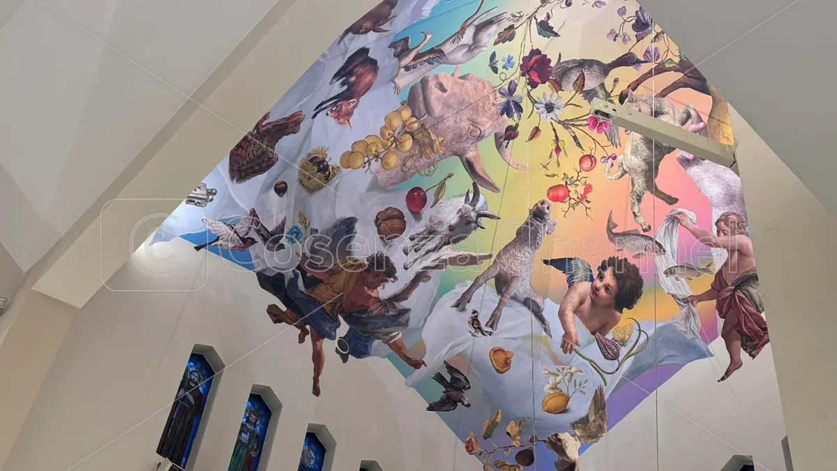 La chiesa di Sant’Aniello a Cosenza si è rifatta il look con un’opera realizzata dall’artista internazionale Austin Young, membro del collettivo americano Fallen Fruit. Il progetto artistico ha mescolato elementi di pittura e upcycling e rappresenta un significativo punto di incontro tra tradizione e innovazione, fede e arte contemporanea. Don Salvatore Fuscaldo, il sacerdote titolare della popolare parrocchia, che proprio ieri compiva otto anni dal suo insediamento, ha optato per “La visione di Pietro” rifacendosi agli Atti degli Apostoli, capitolo 10. In base agli scritti, infatti, San Pietro ebbe una visione di un grande lenzuolo pieno di animali che veniva calato dal cielo.