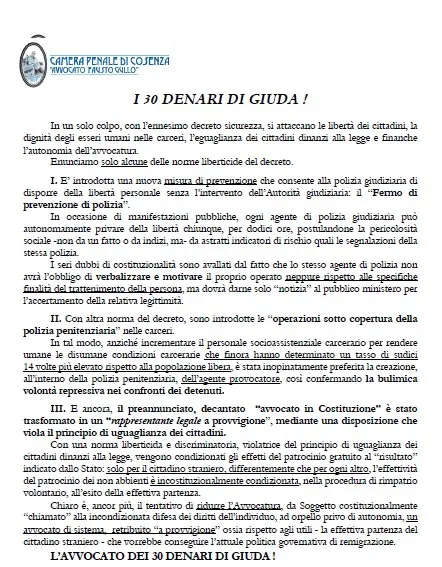 La Camera penale di Cosenza alza il livello dello scontro sul decreto sicurezza e proclama lo stato di agitazione, annunciando possibili iniziative ancora più incisive da condividere con l’intera avvocatura del Foro, con il Coa, il Cpo e la Consulta. Nel documento diffuso dal consiglio direttivo, i penalisti cosentini attaccano frontalmente alcune delle disposizioni contenute nel provvedimento, giudicate lesive delle libertà individuali, della dignità delle persone detenute, del principio di eguaglianza davanti alla legge e dell’autonomia stessa dell’avvocatura.