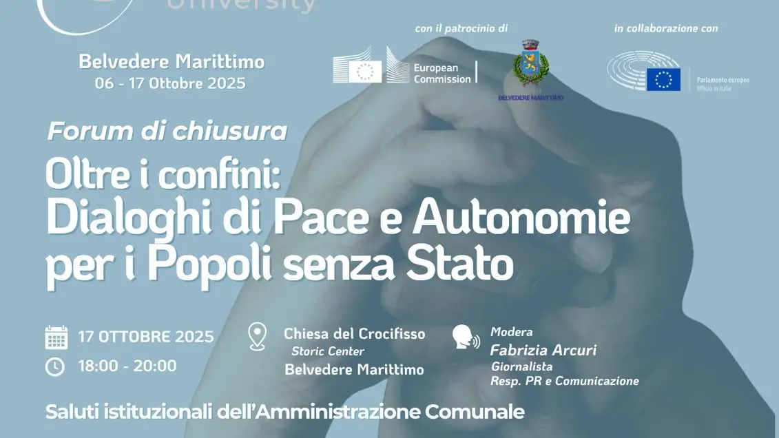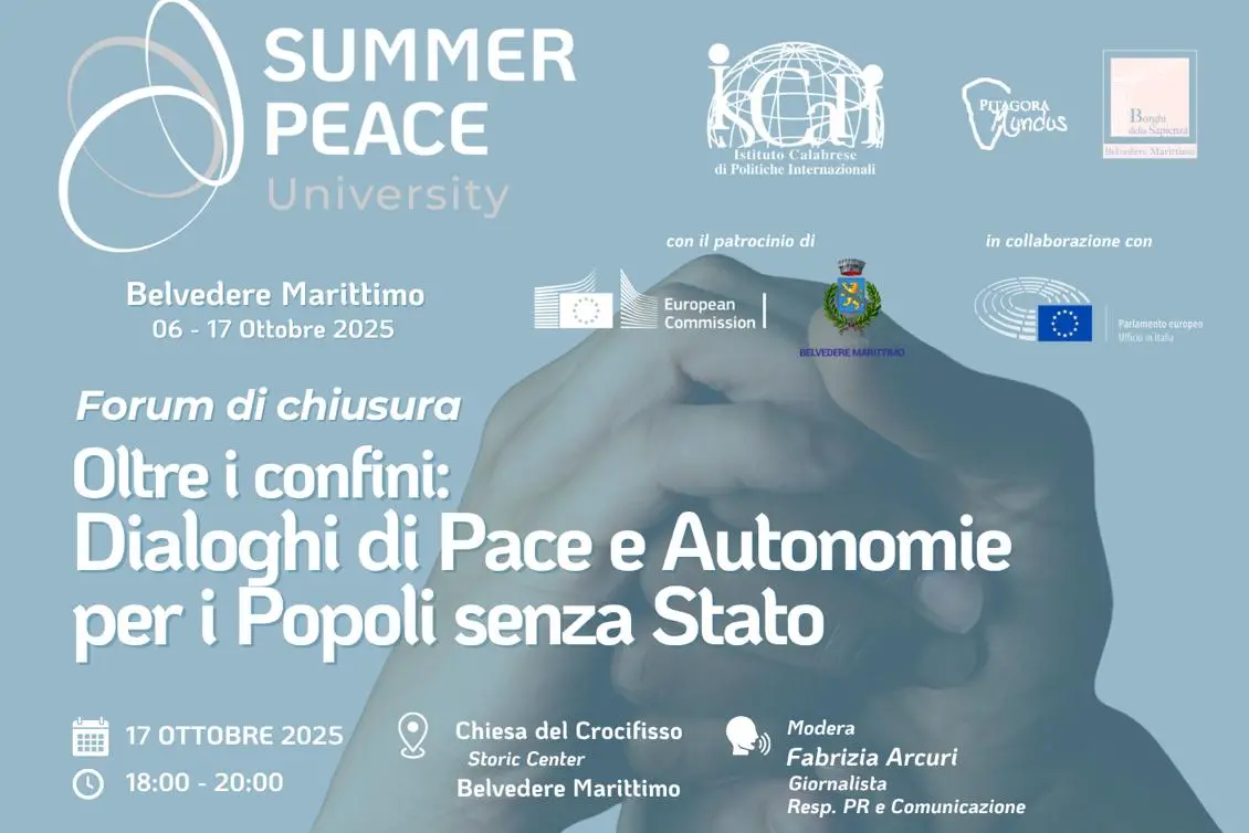 Sarà un momento corale e carico di significato quello che, venerdì 17 ottobre, concluderà la seconda edizione della Summer Peace University (SPU). Il Forum Internazionale, realizzato con il patrocinio della Commissione Europea, aprirà con i saluti istituzionali dell’Amministrazione Comunale di Belvedere Marittimo e vedrà la partecipazione di autorevoli ospiti internazionali: Saywan Sabir Mustafa Barzani, Ambasciatore della Repubblica dell’Iraq presso la Confederazione Svizzera; Emadeldin Mirghani Abdelhamid Altohamy, Chargé d’Affaires a.i. dell’Ambasciata della Repubblica del Sudan; e Domenico Naccari, Console Onorario del Regno del Marocco in Calabria. Insieme a loro, rappresentanti delle istituzioni europee, studiosi e operatori della cooperazione internazionale arricchiranno il confronto su tre assi centrali: i modelli di autonomia nei contesti di conflitto, la diplomazia multilaterale e i processi di pace nel quadro delle trasformazioni geopolitiche in atto.