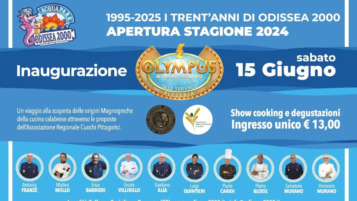 L’estate inizia con grande entusiasmo all’Acquapark Odissea 2000 di Corigliano Rossano, in Calabria. Sabato 15 giugno parte la 30esima stagione di uno dei parchi acquatici più amati d’Italia, offrendo una giornata di divertimento e relax per tutta la famiglia. L’evento prevede anche l’inaugurazione di OLYMPUS – IL PRANZO DEGLI DEI, la nuova area ristoro ispirata ai miti dell’antica Grecia.