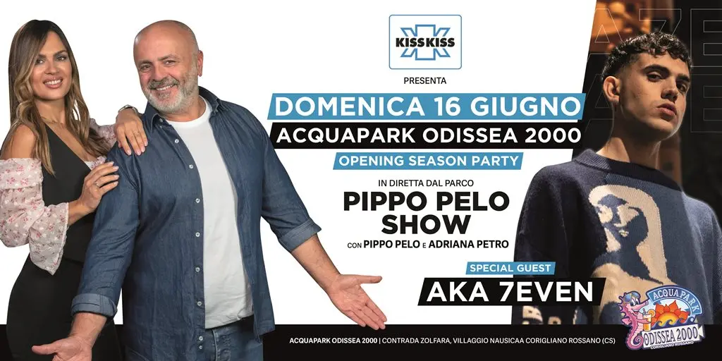 Il weekend prosegue domenica 16 giugno con la diretta di Radio Kiss Kiss da Corigliano Rossano, con la partecipazione di Pippo Pelo, Adriana e Aka 7even. Questo appuntamento segna l’inizio di una serie di eventi musicali e di spettacolo che animeranno l’estate all’Acquapark Odissea 2000.