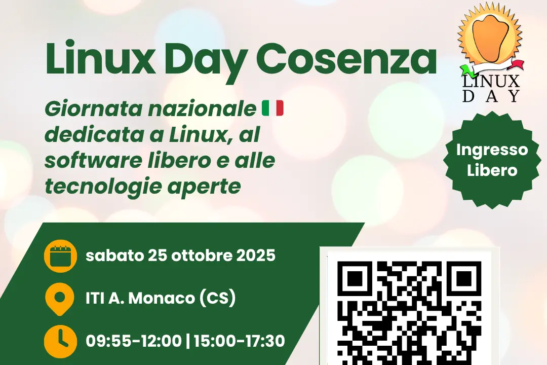 La venticinquesima edizione del Linux Day, l’evento indipendente dedicato a tutte le tecnologie libere e aperte e alla promozione delle libertà digitali, torna a Cosenza il 25 ottobre 2025, ospite dell’Istituto Tecnico Industriale “A. Monaco” in Via Giulia 9 a Cosenza.