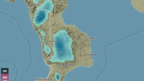 Tra il pomeriggio e le prime ore di giovedì la neve potrà raggiungere i 600-700 m di quota raggiungendo tutte le aree della Sila e del Pollino e relative aree presilane, e paesi come Mendicino, San Sosti, Morano Calabro, Aprigliano, Pedace, San Pietro in Guarano, Verbicaro, Mormanno e aree limitrofe; non sono da escludere anche locali fiocchi di neve svolazzanti a quote più basse ma in questo frangente senza rischio di accumulo al suolo. Da sottolineare comunque che gli accumuli più abbondanti si registreranno soprattutto alle quote medio-alte dove non sono da escludere punte fino ai 100 cm.