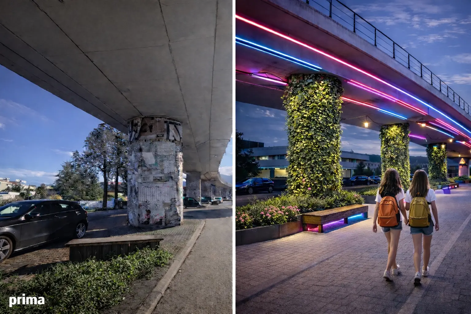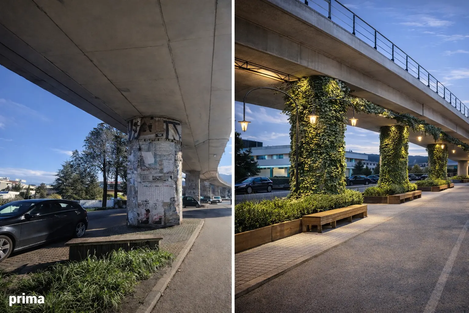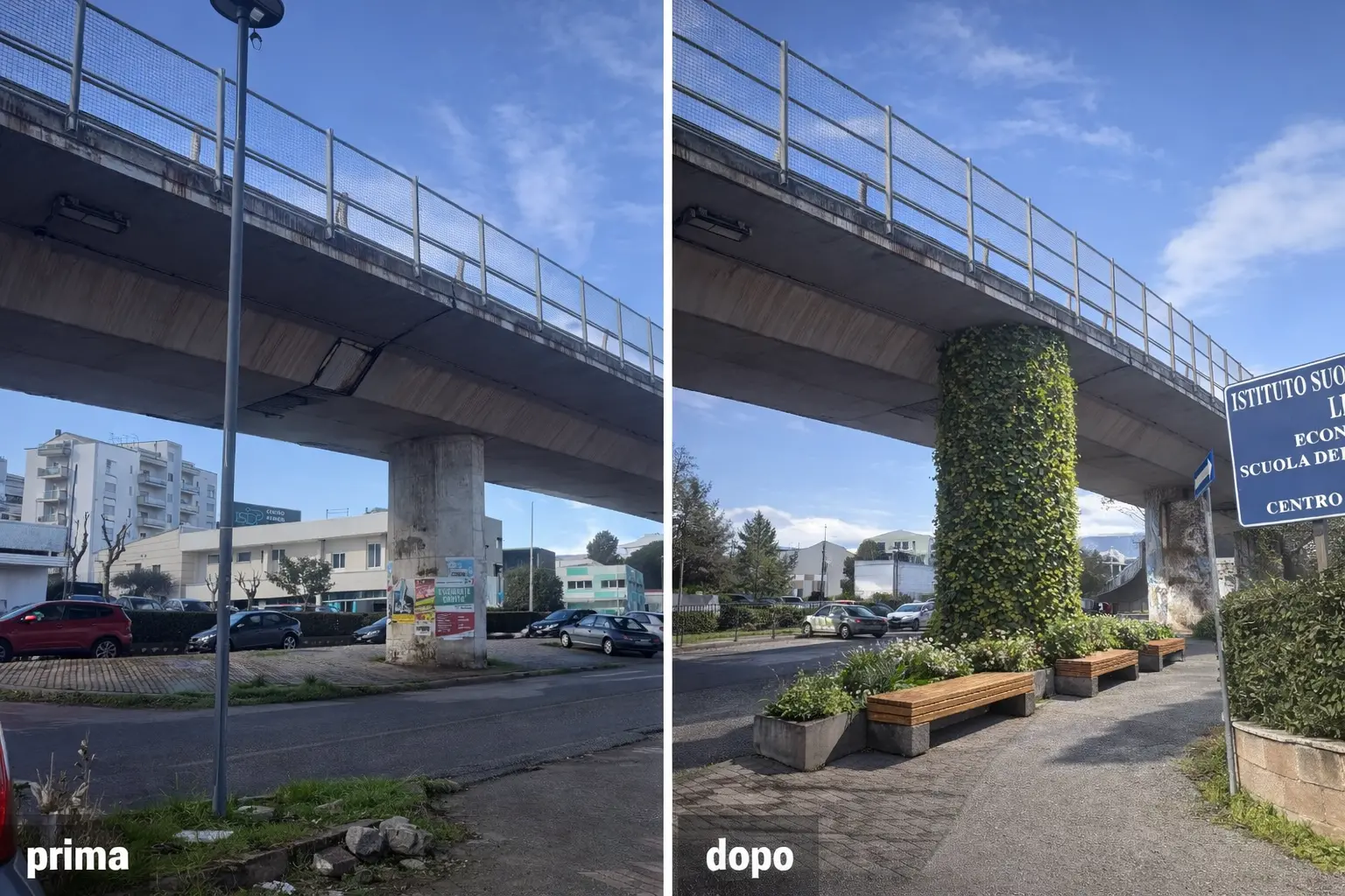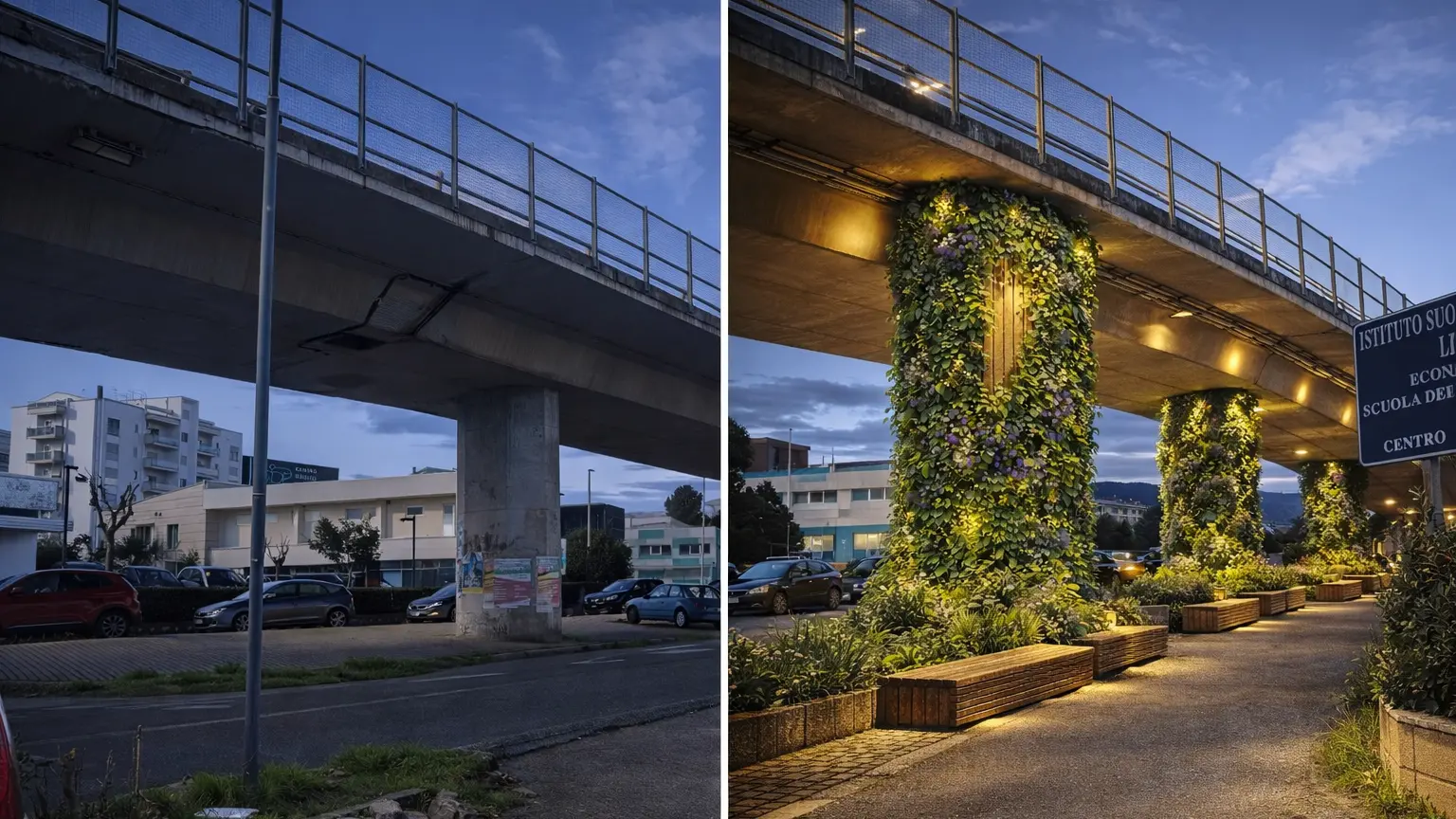 Una simulazione mostra come l’area sotto la superstrada potrebbe diventare uno spazio verde, decoroso e fruibile. Rampicanti, panchine e luci calde al posto di affissioni abusive e cemento sporco