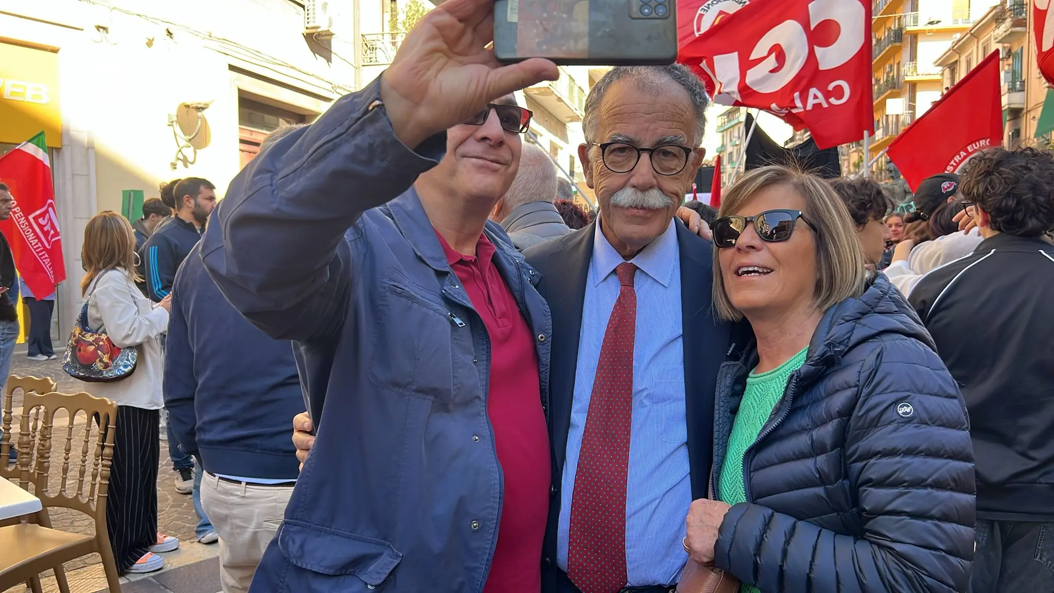 L'europarlamentare Sandro Ruotolo, ricercatissimo per qualche selfie, da Cosenza attacca Salvini, Meloni e Tajani: «La frase del diritto internazionale un tanto al kg è vergognosa, a Gaza in atto un genocidio» ha detto infiammando i presenti.