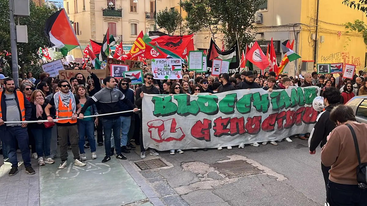 Il corteo pro-Pal di Cosenza è partito intorno alle 10,10 da Piazza Kennedy con migliaia di manifestanti dietro lo striscione "Blocchiamo il Genocidio" e il serpentone non si è indirizzato verso il Comune, bensì verso la centralissima Piazza Bilotti così da imboccare via Alimena.