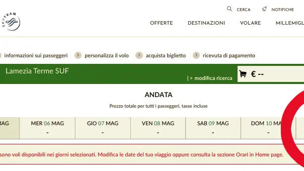 I prezzi degli aerei Alitalia sono tornati a salire vertiginosamente. Alla vigilia dei rientri, permessi per chi ha la residenza in Calabria, le prenotazioni di voli e treni sono andate in tilt. Nessun biglietto disponibile sul sito e sulla app Trenitalia fino al 9 maggio, e niente aerei fino al 13, data in cui per mettersi in viaggio e arrivare a Lamezia Terme, occorrerà sborsare 345 euro. Una cifra molto distante dai 47 euro che bastavano fino a poche settimane fa per tornare al Sud. Parliamo di quasi 8 volte tanto.