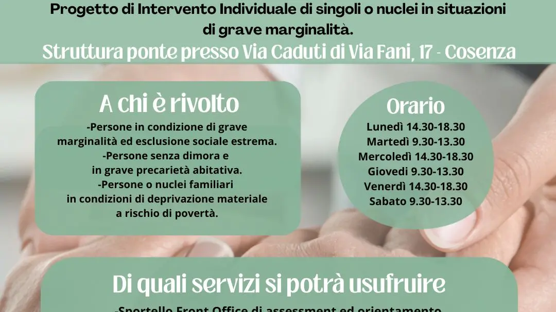 La Stazione di Posta Cosenza apre le sue porte in via Caduti di via Fani, 17, come nuovo presidio sociale per chi vive in strada o in condizioni di grave marginalità. L’Amministrazione comunale, con il Sindaco Franz Caruso e l’Assessore al welfare Veronica Buffone, sceglie di rafforzare la rete del welfare cittadino con uno spazio dedicato ai bisogni più basilari: casa, documenti, orientamento, ascolto.