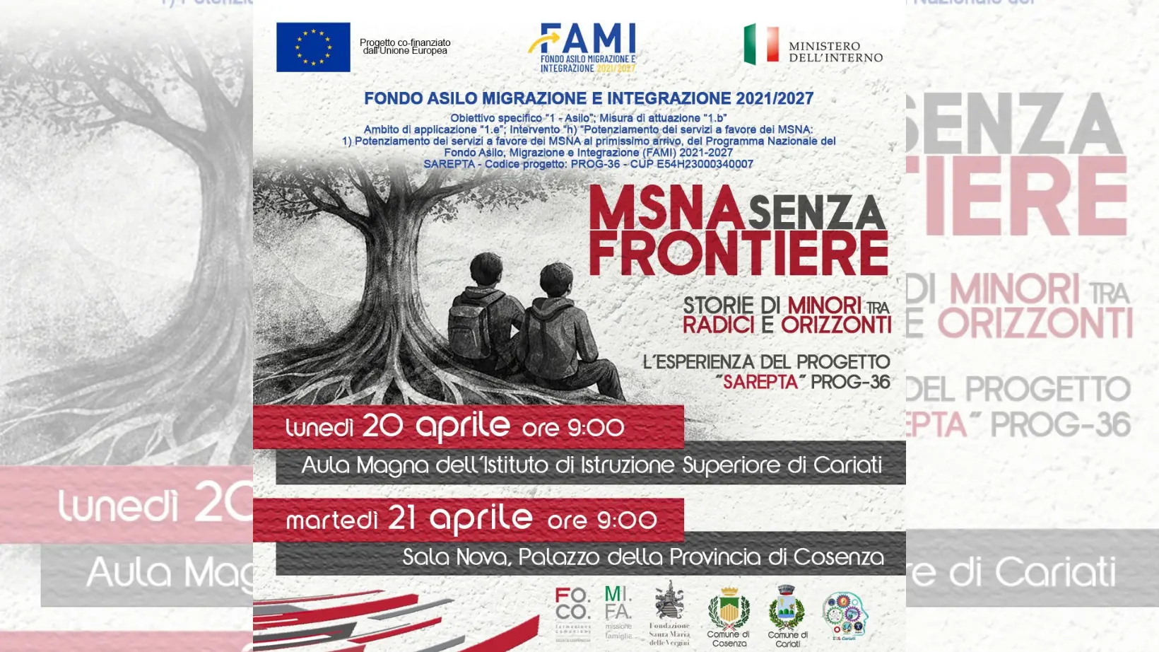 Si terrà lunedì 20 aprile alle ore 9:00, presso l’Aula Magna dell’Istituto di Istruzione Superiore di Cariati, e martedì 21 aprile alle ore 9:00, presso la Sala Nova del Palazzo della Provincia di Cosenza, il secondo ciclo di convegni dedicato ai minori stranieri non accompagnati nell’ambito del progetto Sarepta – Prog‑36: un dispositivo di accoglienza per i minori stranieri non accompagnati, cofinanziato dall’Unione Europea attraverso il Fondo Asilo, Migrazione e Integrazione (Fami) 2021–2027.