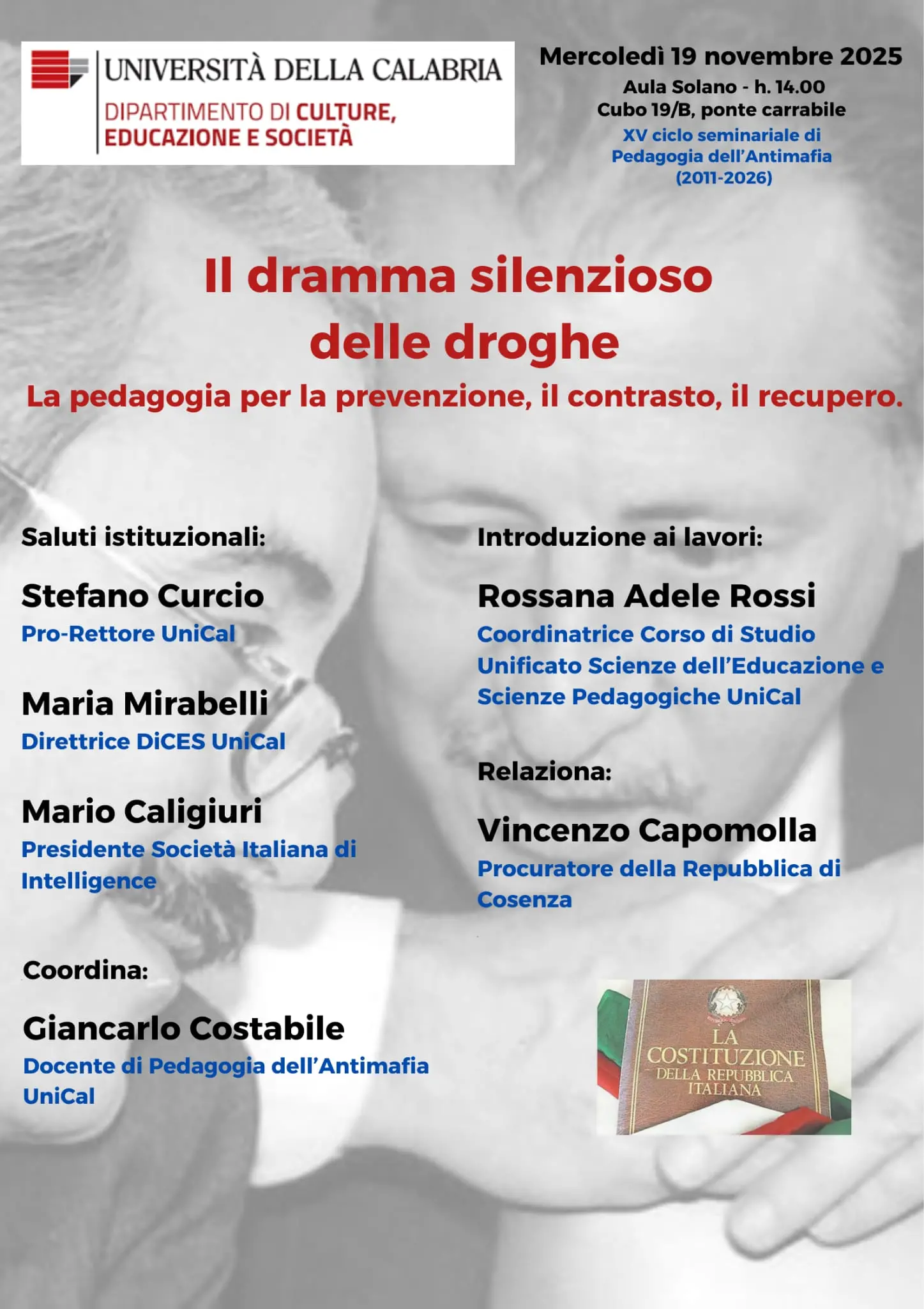 Importante appuntamento domani, mercoledì 19 novembre, all’Università della Calabria. Il procuratore capo di Cosenza, Vincenzo Capomolla, incontrerà alle 14.00, nell’aula Solano (cubo 19/b, ponte carrabile), gli studenti e le studentesse di Scienze dell’Educazione per discutere di contrasto alle dipendenze da droghe.