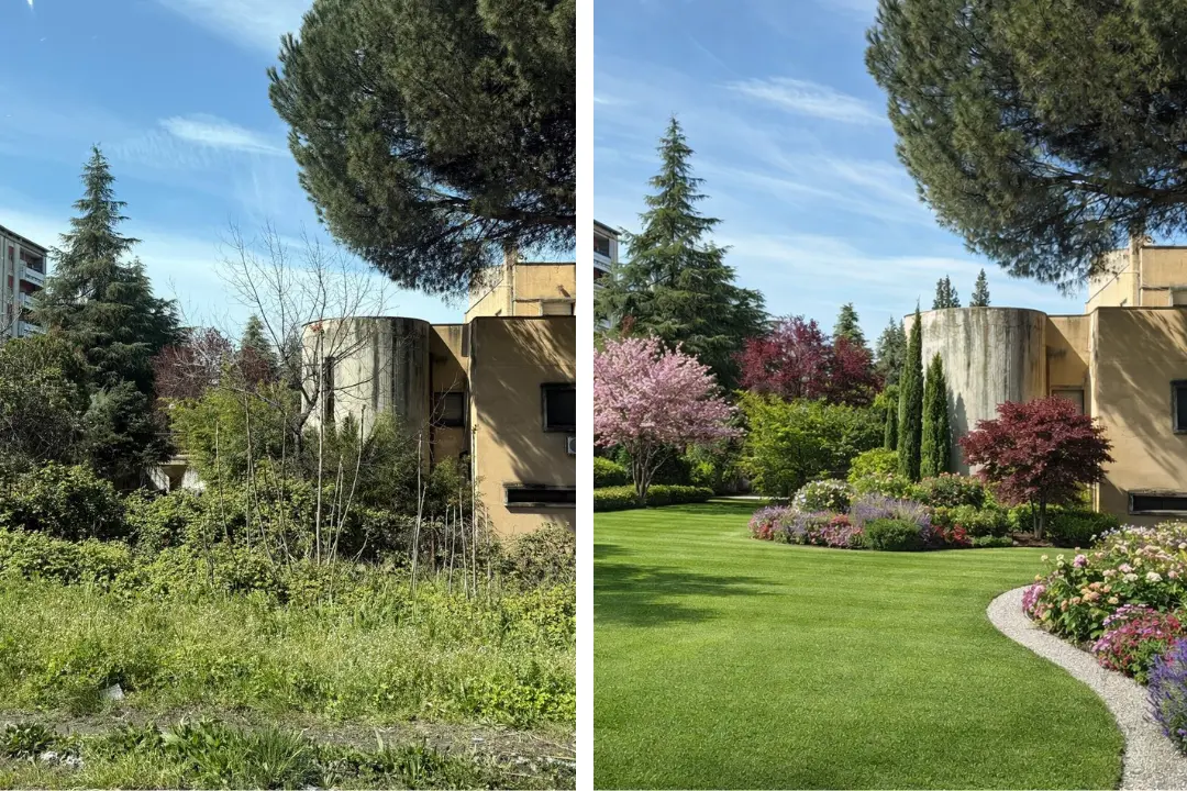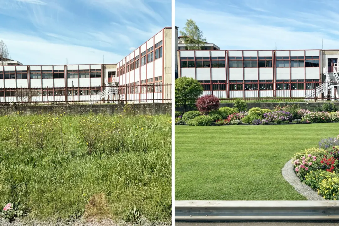Lo stesso vale per l’area della scuola elementare Cuturella. Oggi lo spazio esterno appare come un terreno incolto; nella simulazione diventa un giardino scolastico con prato, alberi per l’ombra, fiori e panchine. La differenza tra degrado e decoro, spesso, non sta in grandi opere ma in interventi semplici.