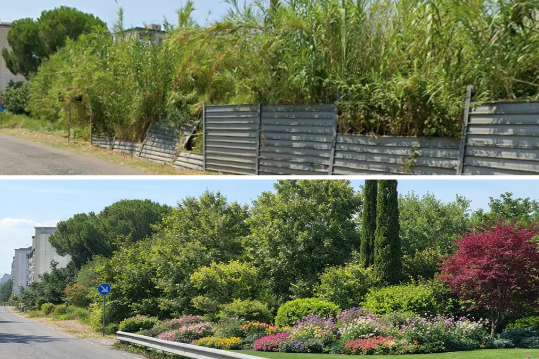 Nella visione ricostruita con l’intelligenza artificiale, le aree oggi occupate da erbacce e terreni incolti diventano prati curati, con alberi, aiuole fiorite, panchine e rastrelliere per biciclette. Lungo la superstrada, davanti al carcere, la fascia verde potrebbe trasformarsi in un corridoio urbano ordinato, con prato, un filare di alberi e aiuole basse: uno spazio semplice, pulito, decoroso.