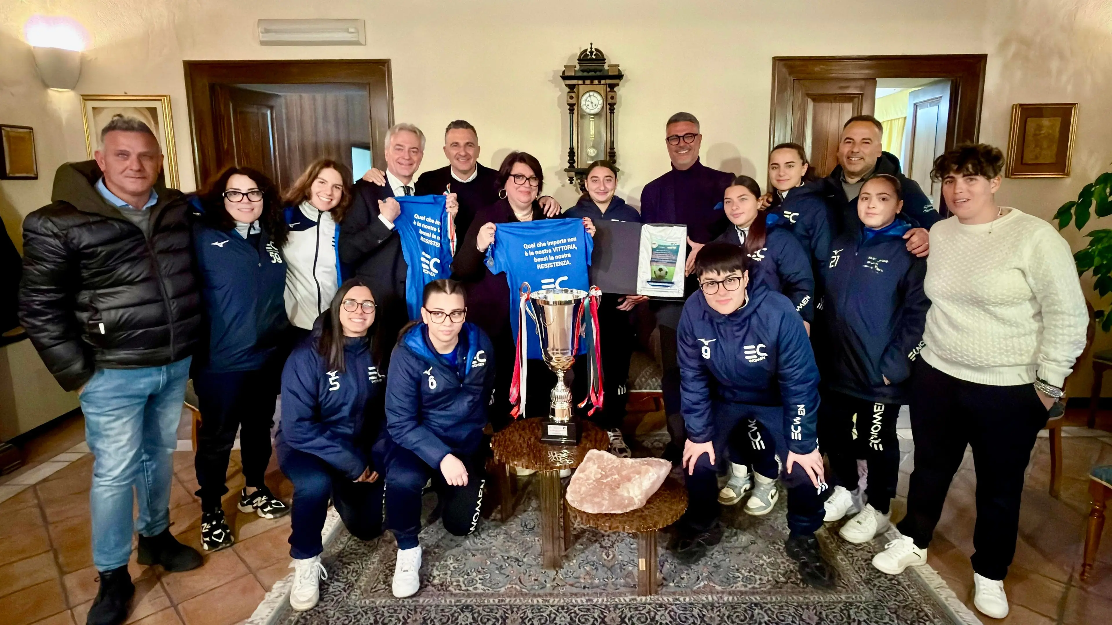 Un traguardo importante, che rappresenta non solo un successo sportivo, ma anche il simbolo di un movimento in crescita e di una comunità che crede fortemente nello sport come strumento di inclusione, crescita e valorizzazione dei talenti. Proprio per celebrare questo risultato, la squadra è stata accolta presso la casa comunale, in un momento istituzionale carico di significato, alla presenza del sindaco Francesco Serra, della delegata allo sport Annamaria Buono, del consigliere comunale Aldo Figliuzzi, del consigliere regionale Orlandino Greco e dell’Assessore regionale Gianluca Gallo.