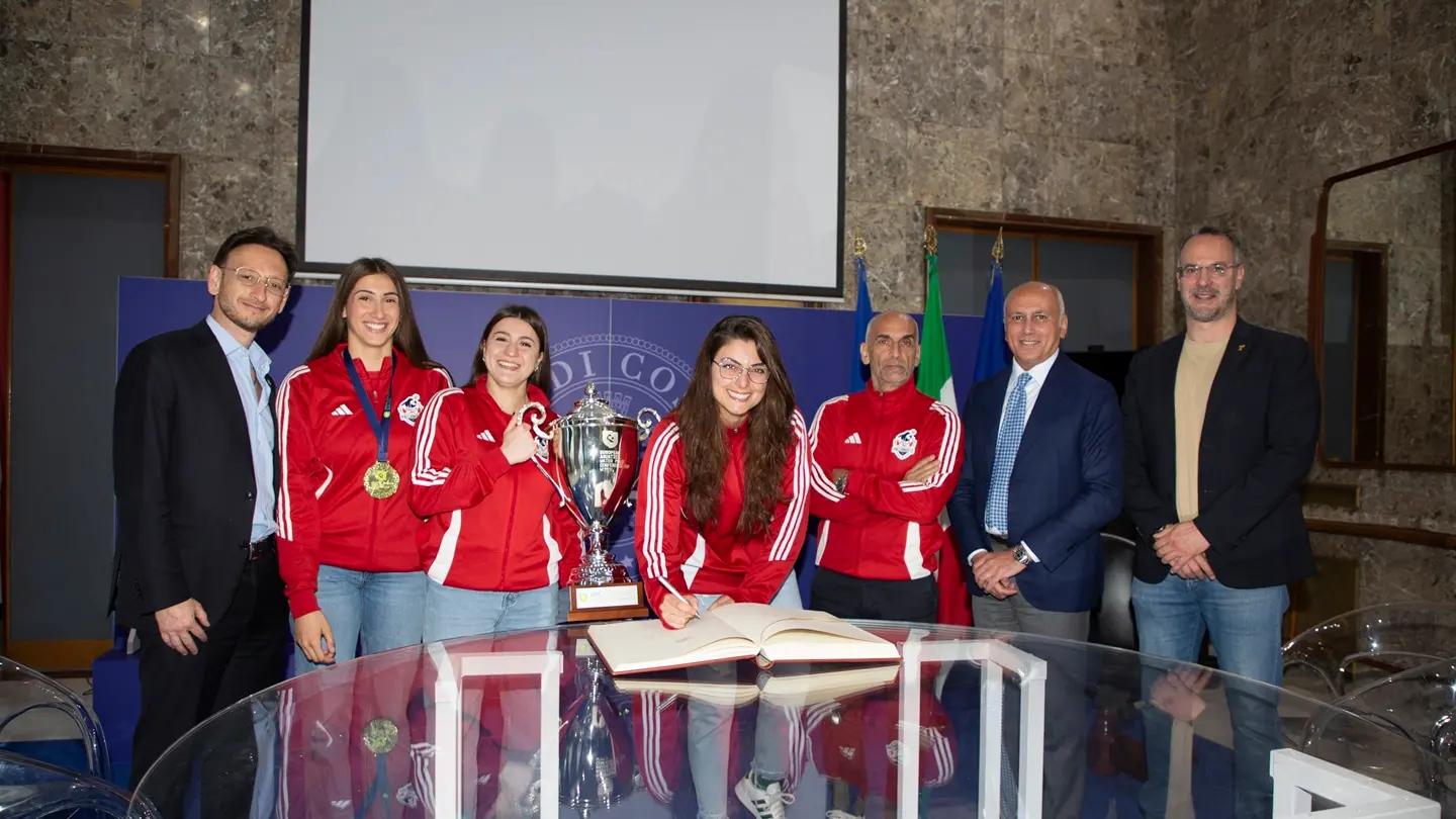 Le pallanuotiste ricevute dal sindaco Caruso dopo la vittoria della Conference Cup ad Atene