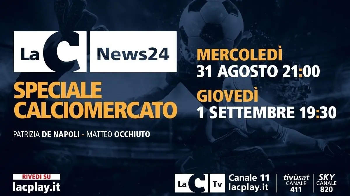 Una due giorni di sport intensa da segnare in agenda e da non perdere, per gli amanti del calcio e non solo. Torna su LaC tv lo speciale dedicato al calciomercato condotto da Patrizia De Napoli. Mercoledì 31 agosto, dalle 21 alle 22 e giovedi 1 settembre dalle 19 30 in diretta, vi aggiorneremo sugli ultimi due giorni di calciomercato.