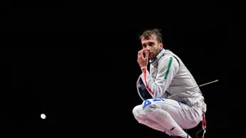 In lacrime Garozzo, con le mani sul volto e consolato dal suo allenatore dopo la finale persa. Per l’oro di Rio 2016 un amaro argento a Tokyo.